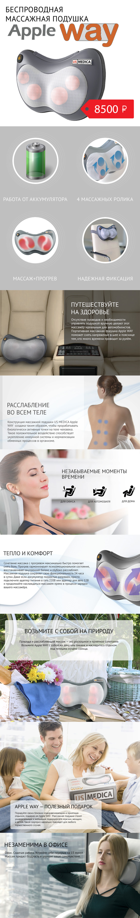 Отзыв: Мне очень нравиться массажная подушка APPLE WAY. Она отлично помогает расслабиться, хорошо снимает мышечную боль и поднимает моим домочадцам настроение. я ценю дополнительная функция прогрева массажных роликов. Прогрев делает массаж еще приятнее и помогает лучше расслабиться. А встроенный аккумулятор сделал подушку незаменимой вещью где бы мы ни находились. Используем дома, берем с собой в отпуск, в машину. Очень удобно, когда нет привязки к сети. У моей мамы перестала болеть шея и прекратились головные боли. Так что, смело рекомендую к использованию. Будьте здоровыми!